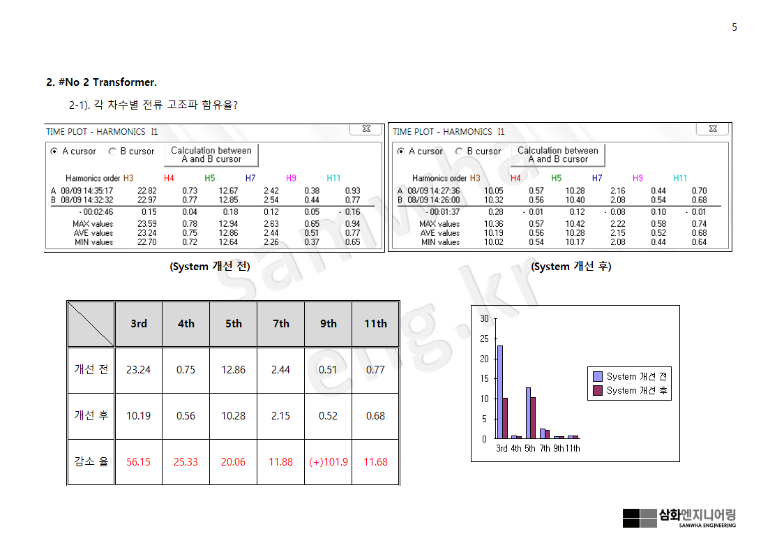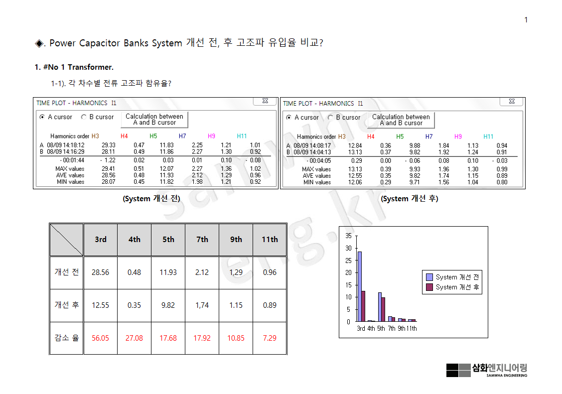 콘덴서 뱅크 고조파 억제를 위한 시스템 개선 전, 후 콘덴서 측의 고조파 유입율에 대해 살펴본다.