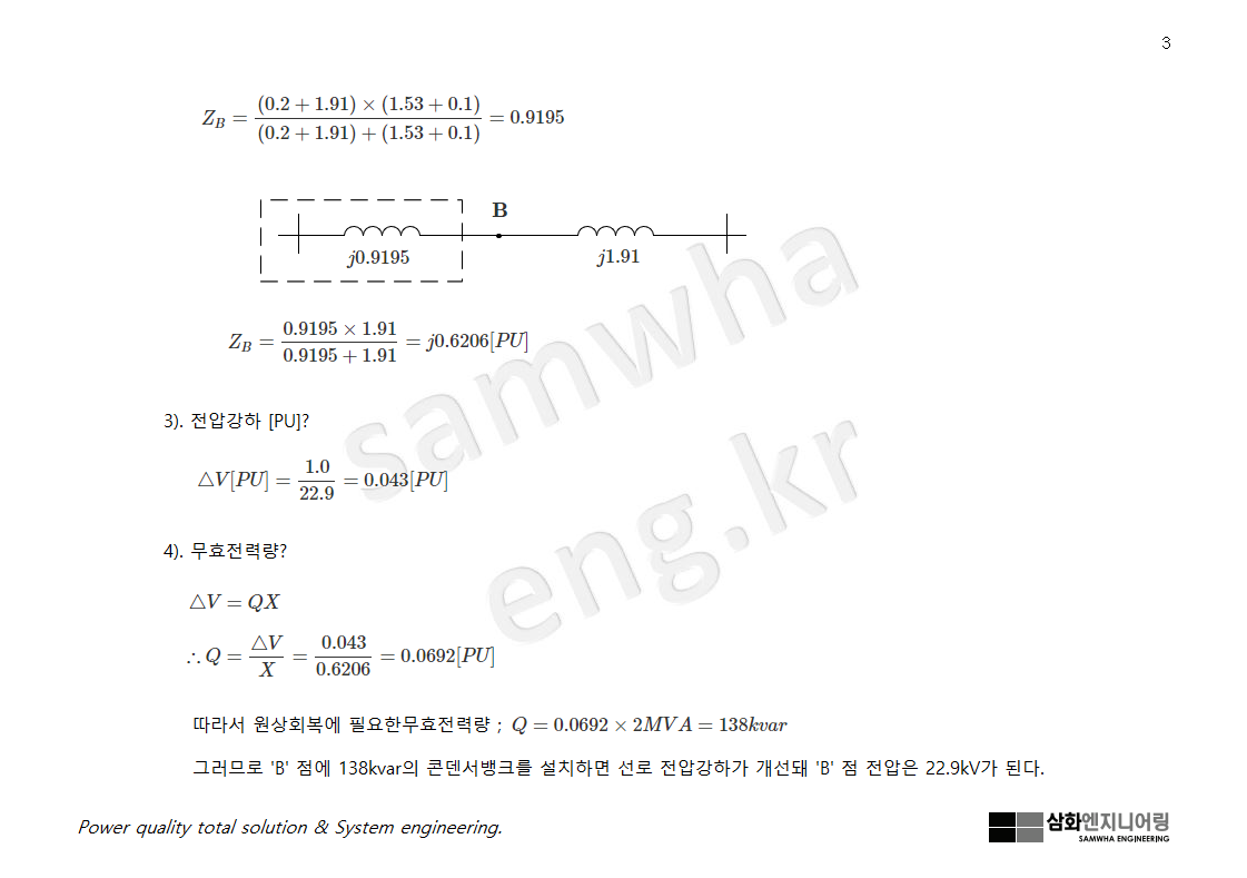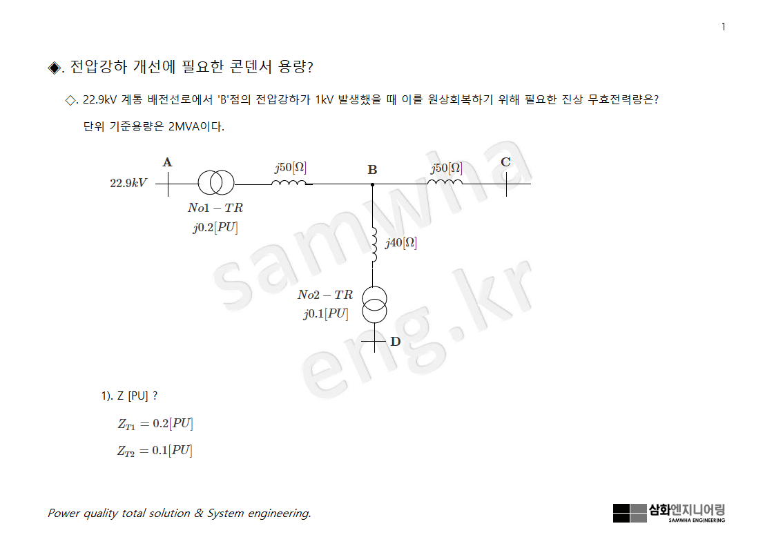 조건이 아래와 같음으로 얼마의 콘덴서 투입(무효전력 보상)으로 전압강하가 개선되는지 이하에 살펴본다.