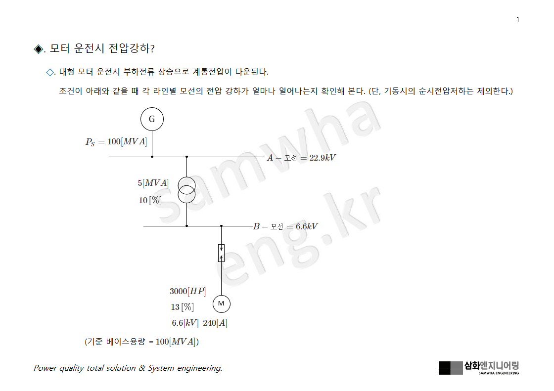 대형 모터를 운전할 때 무효전력 증가에 따른 부하전류 상승으로 큰 폭의 전압강하가 발생하게 된다.