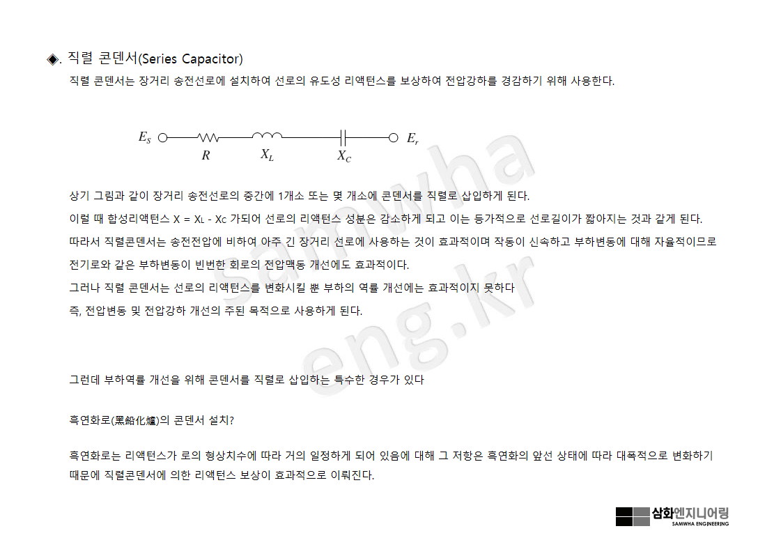 - 선로의 유도성 리액턴스를 보상하므호 선로의 전압 강하를 줄이게 된다.