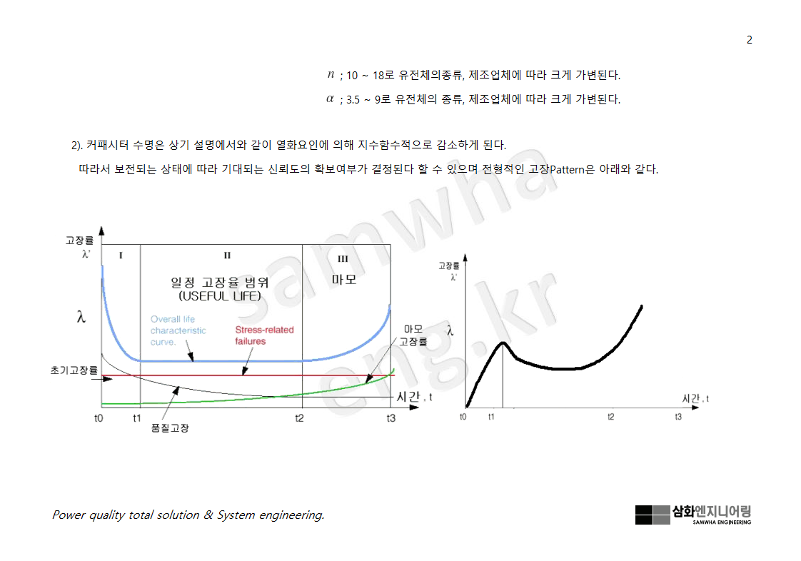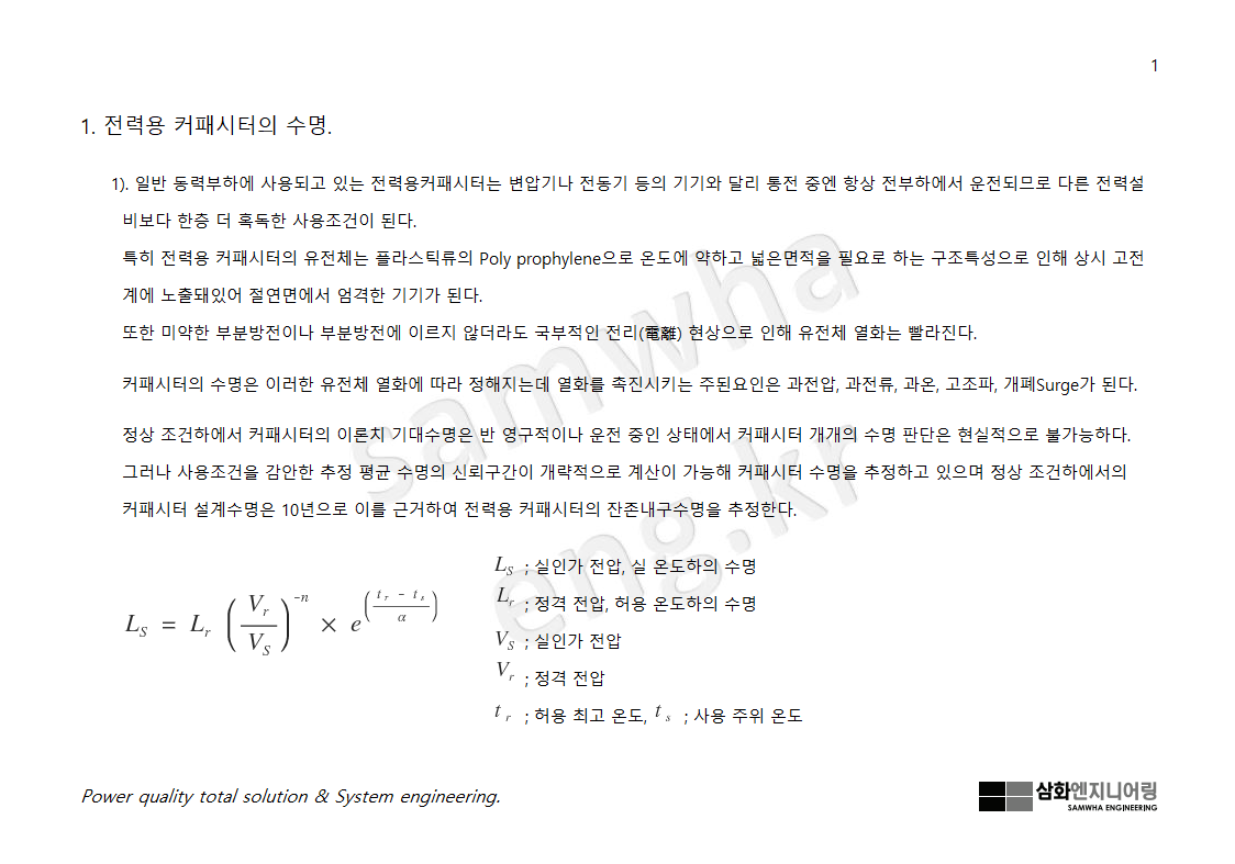 역률개선 및 전압강하 보상 목적으로 부하에 병렬 결선하여 사용하는 중요 전력설비 중 하나인 전력용 커패시터의 수명에 대해 아래와 같이 살펴본다.