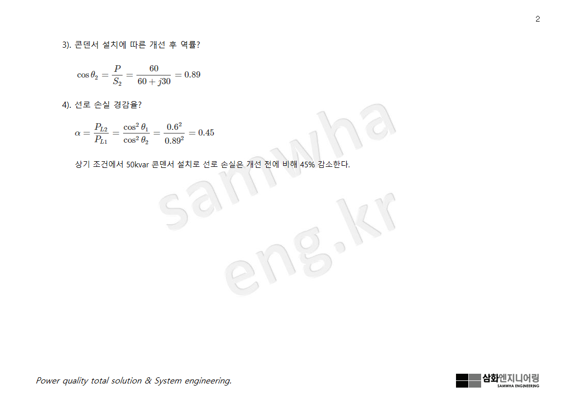전력용 콘덴서 설치로 역률 개선 시 선로손실 감소율이 어떻게 되는지 아래와 같이 살펴본다.