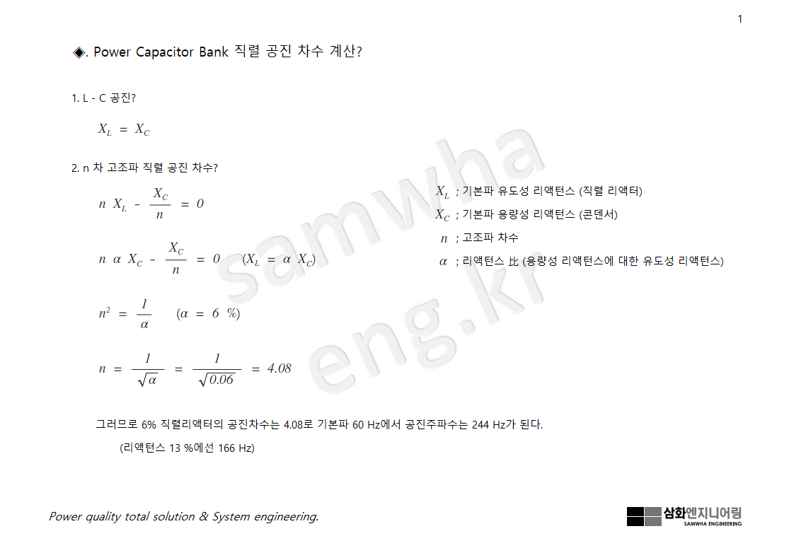 그러므로 파워 커패시터 뱅크에 직렬 리액터 선정시 어느 주파수대에서 직렬공진이 발생되는지 그 공진차수를 알고 대처해야 한다.